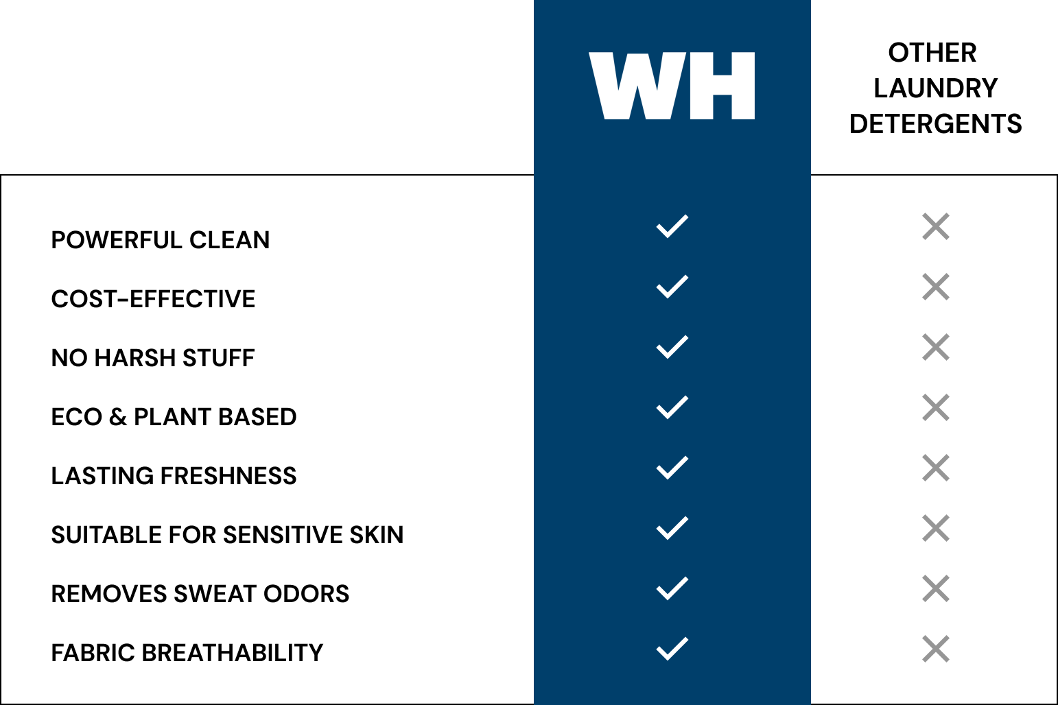 WH offers powerful, professional-grade cleaning. Our formula is designed and performance-tested to clean just as well, or better, than leading generic detergent brands. It tackles everything from coffee stains to grass stains and more. This formula is great for any fabric you throw in regular or permanent press washes like cotton, poly-blends, and delicates.